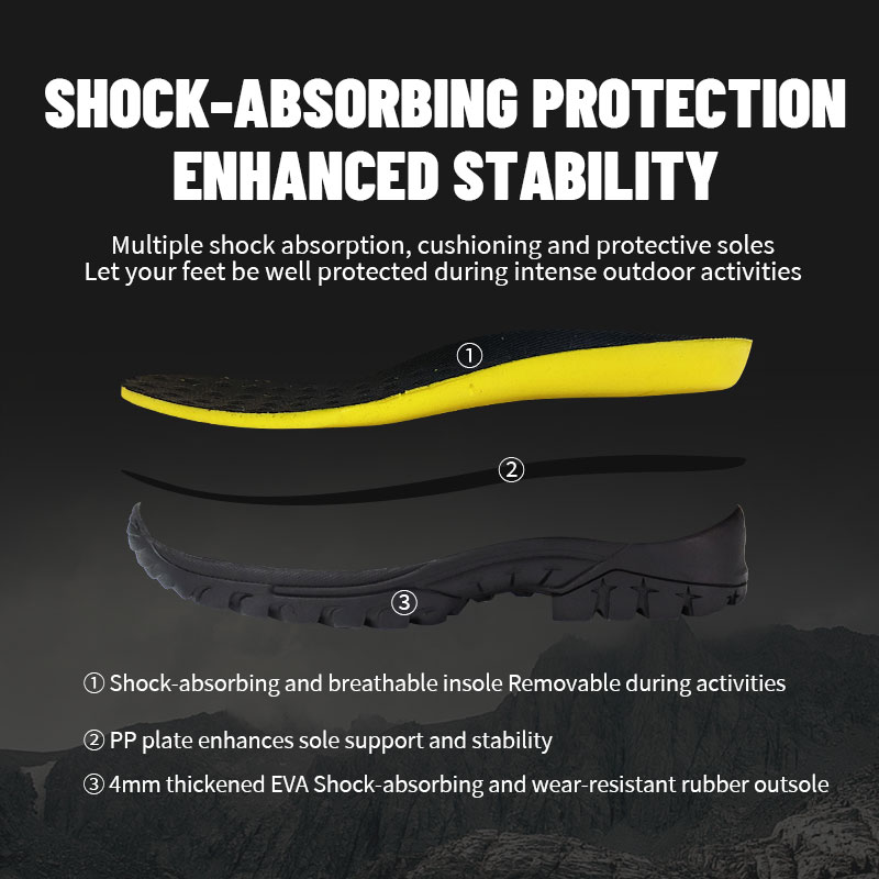 ①Yastıklı, nefes alabilen iç taban; temizlemeniz veya değiştirmeniz gerektiğinde çıkarılabilir. ②Ekstra ayak altı desteği için PP plakayla güçlendirilmiştir; böylece her adım sağlam ve kontrollü hissedilir. ③4mm Kalınlaştırılmış EVA şok emici ve aşınmaya dayanıklı kauçuk dış taban.